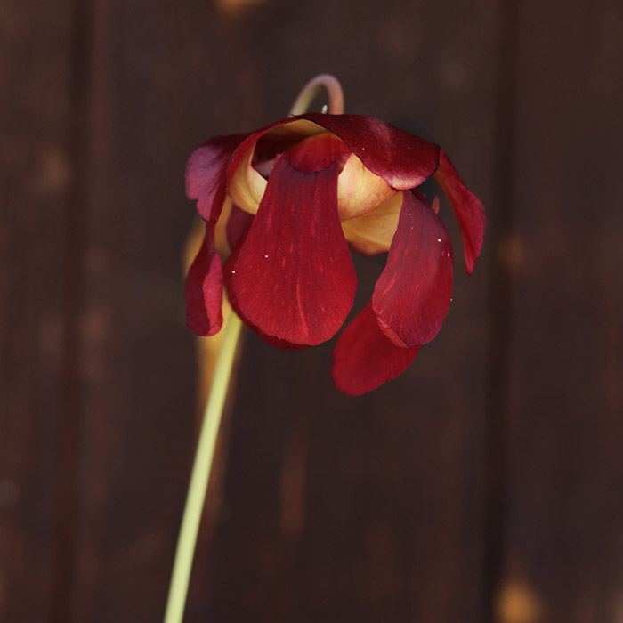 Grown from seed collected from plants growing alongside the drainage ditches feeding the Okefenokee Swamp in Georgia. The parent plants reach over 90cm high with robust pitchers. This is very majestic plant and one of our favourites. The tall traps turn a deep rich red but retain some minor spotting at the back of the trap. A good vigorous grower with the traps lasting well over the winter. A large deep red flower. Superb colouration with copper/red tops and white windows at the back and extending down the tube. Extremely vigorous. A late season plant. Traps are produced later than eg Sarracenia flava, but stay well into the autumn/winter. Traps reach 60cm.
