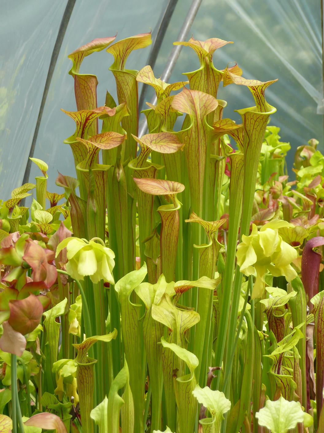 Sarracenia flava ‘Strained’ is a S. flava cuprea obtained by Phil Wilson from a german CP grower who had named it. Phil grew this for a few years but it did not impress so he passed it on to us. After potting on, the plants responded by growing to be the tallest of all the flavas, beating Slacks cv ‘Maxima’ each year.
